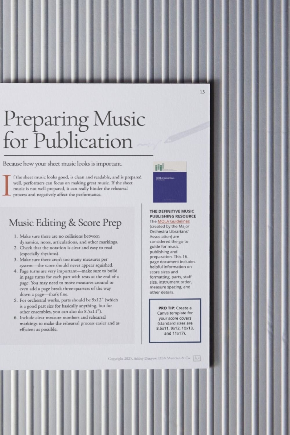 - Prepare for publication & distribution: Learn how to format and proof your scores (includes an editing checklist + score size reference).